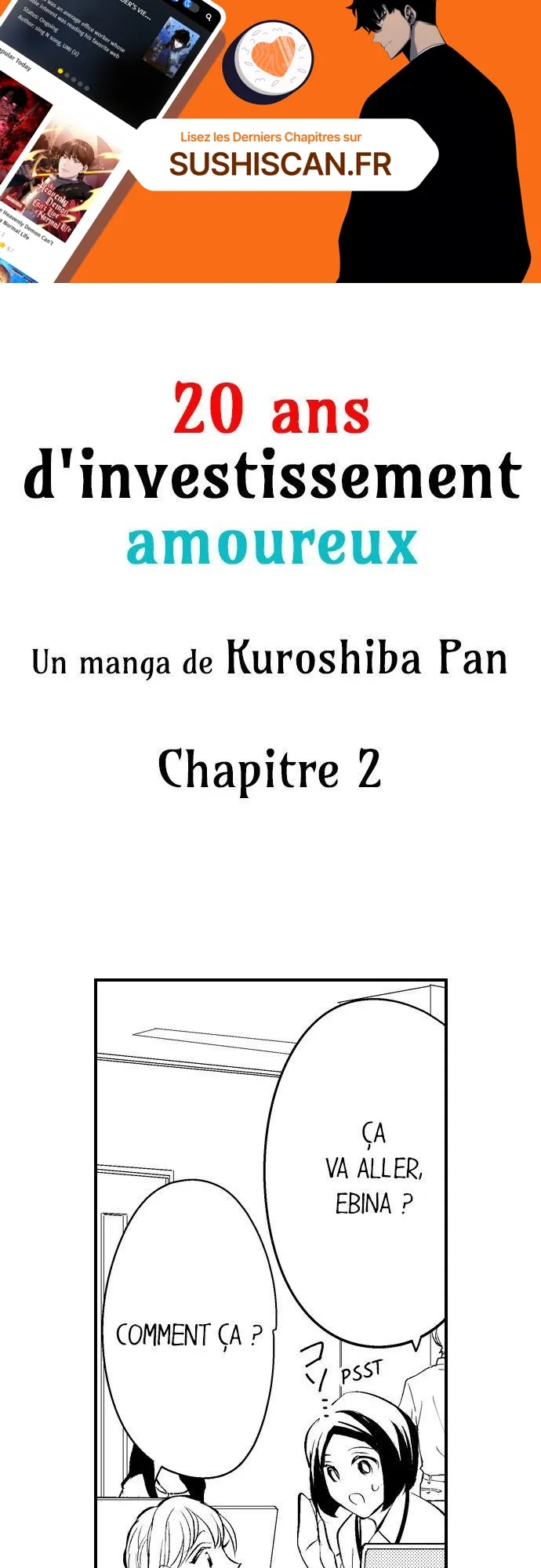 Lisez le dernier manga 20 ans d’investissement amoureux Chapitre 2 sur SushiScan. Le manga 20 ans d’investissement amoureux est toujours mis à jour sur SushiScan. N'oubliez pas de lire les autres mises à jour de manga. Une liste de collections de manga SushiScan se trouve dans le menu Liste de manga.