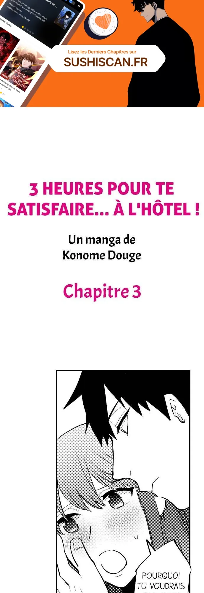 Lisez le dernier manga 3 heures pour te satisfaire… À l’hôtel ! Chapitre 3 sur SushiScan. Le manga 3 heures pour te satisfaire… À l’hôtel ! est toujours mis à jour sur SushiScan. N'oubliez pas de lire les autres mises à jour de manga. Une liste de collections de manga SushiScan se trouve dans le menu Liste de manga.