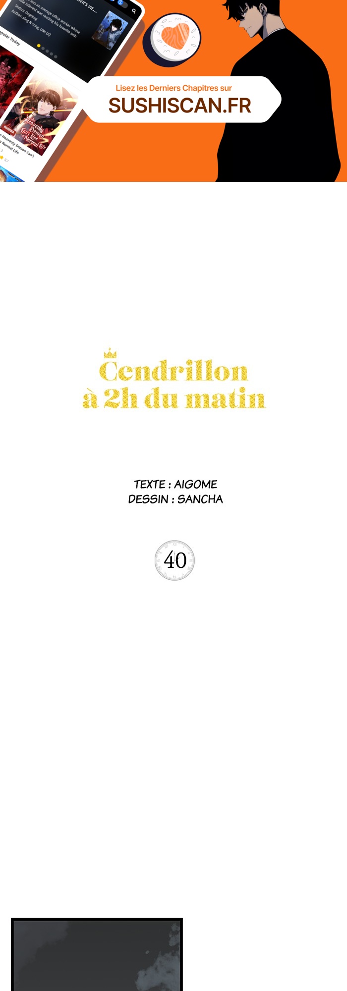 Lisez le dernier manga Cendrillon à 2h du matin Chapitre 40 sur SushiScan. Le manga Cendrillon à 2h du matin est toujours mis à jour sur SushiScan. N'oubliez pas de lire les autres mises à jour de manga. Une liste de collections de manga SushiScan se trouve dans le menu Liste de manga.