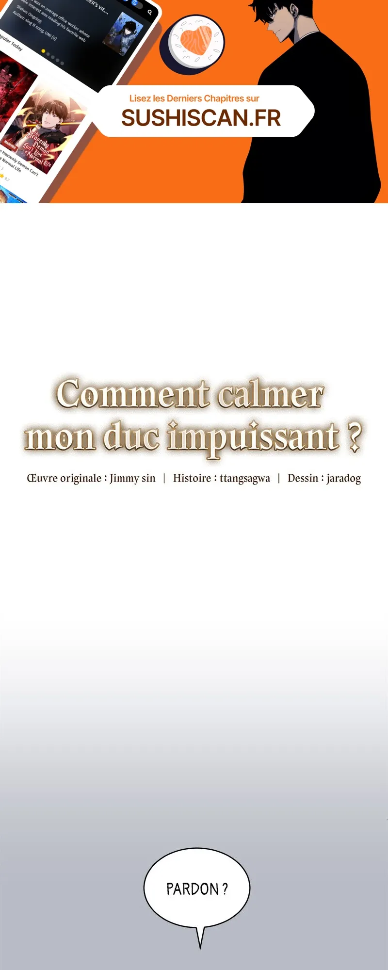 Lisez le dernier manga Comment calmer mon duc impuissant ? Chapitre 37 sur SushiScan. Le manga Comment calmer mon duc impuissant ? est toujours mis à jour sur SushiScan. N'oubliez pas de lire les autres mises à jour de manga. Une liste de collections de manga SushiScan se trouve dans le menu Liste de manga.