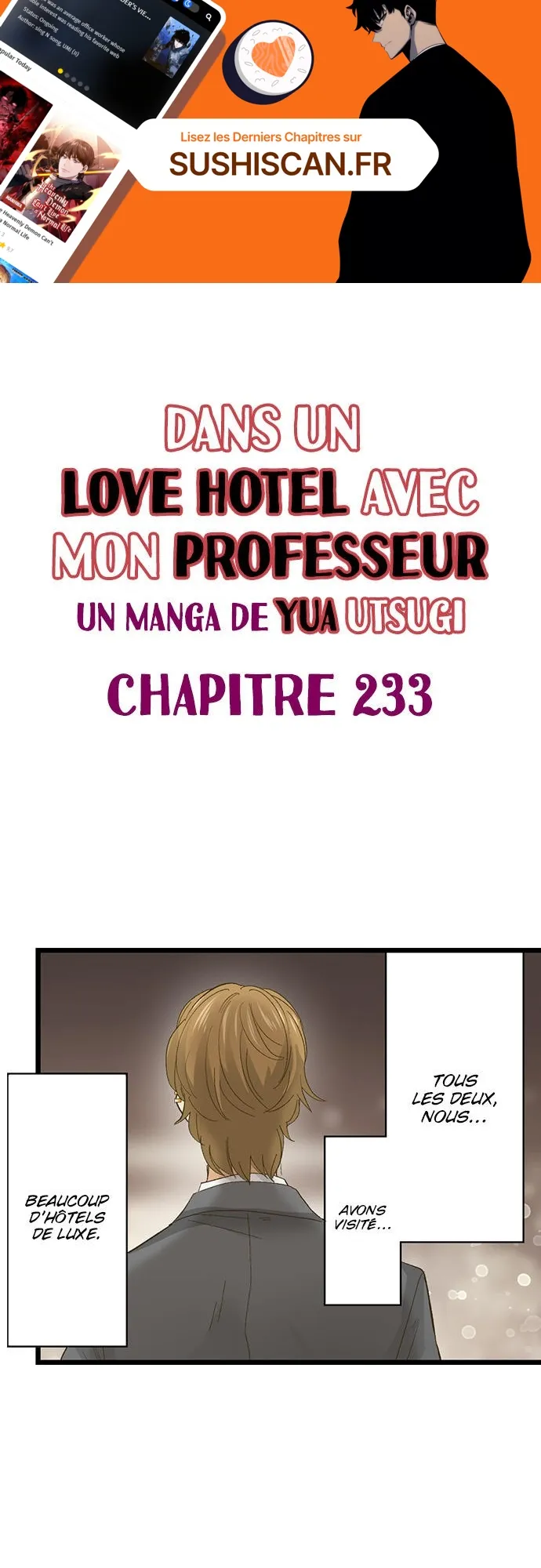 Lisez le dernier manga Dans un Love Hotel avec mon professeur Chapitre 233 sur SushiScan. Le manga Dans un Love Hotel avec mon professeur est toujours mis à jour sur SushiScan. N'oubliez pas de lire les autres mises à jour de manga. Une liste de collections de manga SushiScan se trouve dans le menu Liste de manga.
