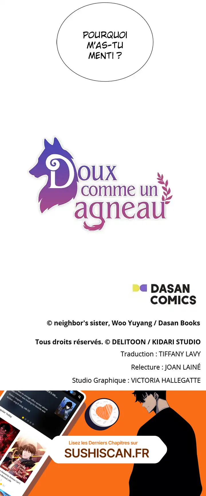 Lisez le dernier manga Doux comme un agneau Chapitre 6 sur SushiScan. Le manga Doux comme un agneau est toujours mis à jour sur SushiScan. N'oubliez pas de lire les autres mises à jour de manga. Une liste de collections de manga SushiScan se trouve dans le menu Liste de manga.