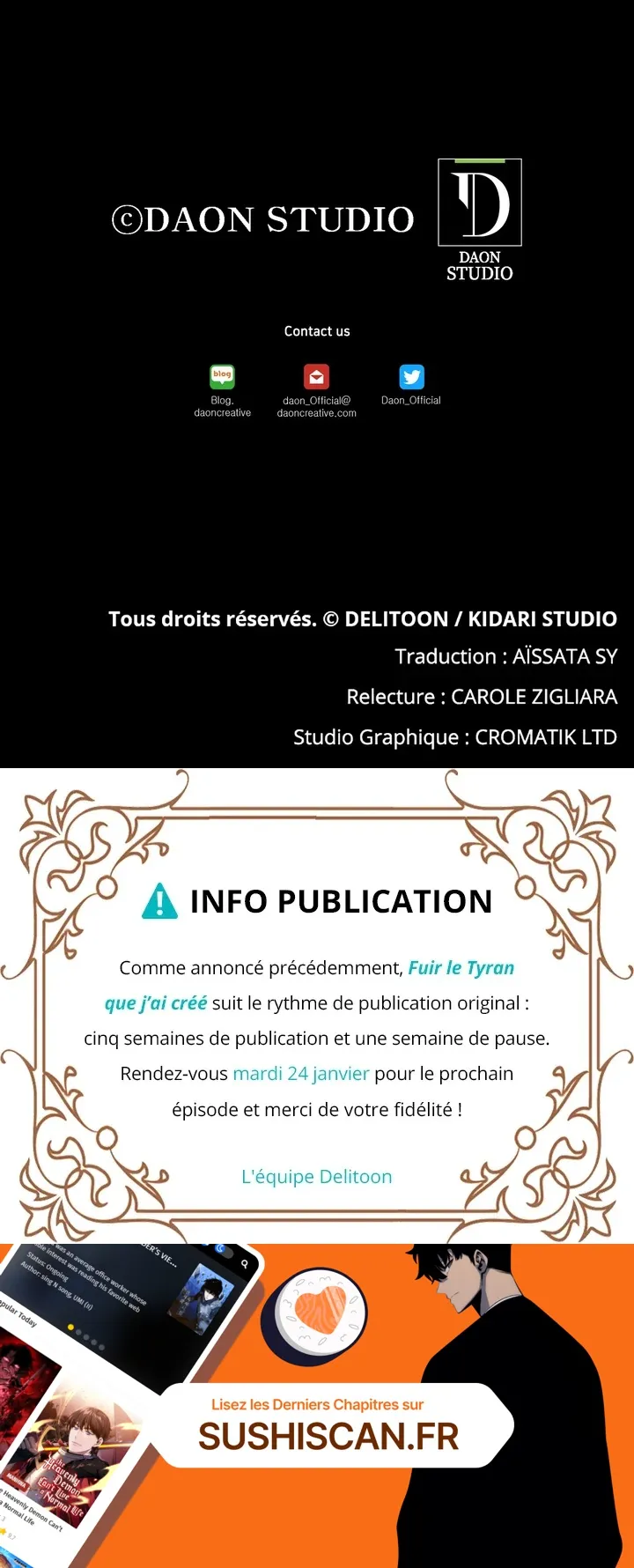 Lisez le dernier manga Fuir le Tyran que j’ai créé Chapitre 76 sur SushiScan. Le manga Fuir le Tyran que j’ai créé est toujours mis à jour sur SushiScan. N'oubliez pas de lire les autres mises à jour de manga. Une liste de collections de manga SushiScan se trouve dans le menu Liste de manga.