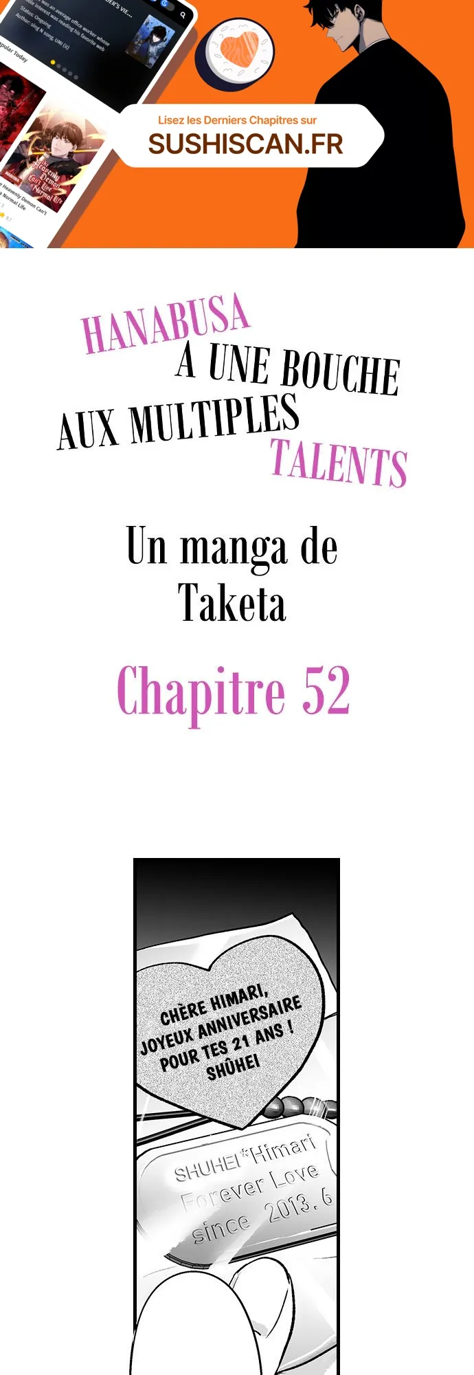 Lisez le dernier manga Hanabusa a une bouche aux multiples talents Chapitre 52 sur SushiScan. Le manga Hanabusa a une bouche aux multiples talents est toujours mis à jour sur SushiScan. N'oubliez pas de lire les autres mises à jour de manga. Une liste de collections de manga SushiScan se trouve dans le menu Liste de manga.