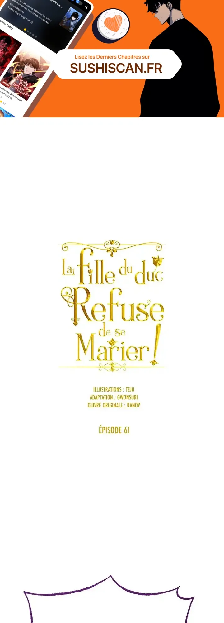 Lisez le dernier manga La fille du duc ne veut pas se marier ! Chapitre 61 sur SushiScan. Le manga La fille du duc ne veut pas se marier ! est toujours mis à jour sur SushiScan. N'oubliez pas de lire les autres mises à jour de manga. Une liste de collections de manga SushiScan se trouve dans le menu Liste de manga.