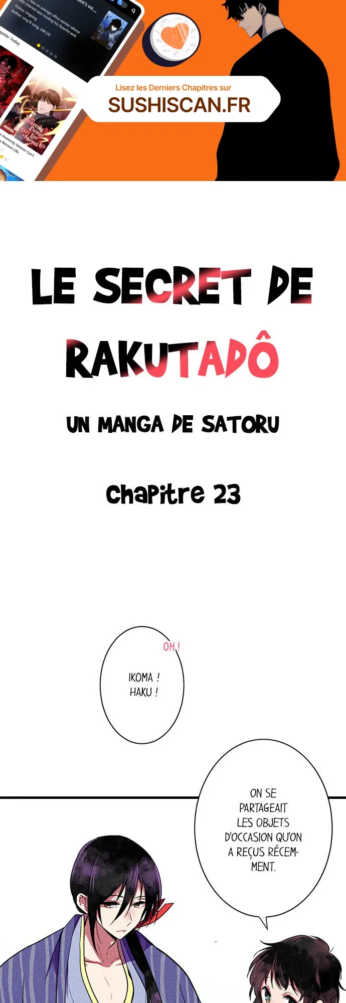 Lisez le dernier manga Le secret de Rakutadô Chapitre 23 sur SushiScan. Le manga Le secret de Rakutadô est toujours mis à jour sur SushiScan. N'oubliez pas de lire les autres mises à jour de manga. Une liste de collections de manga SushiScan se trouve dans le menu Liste de manga.