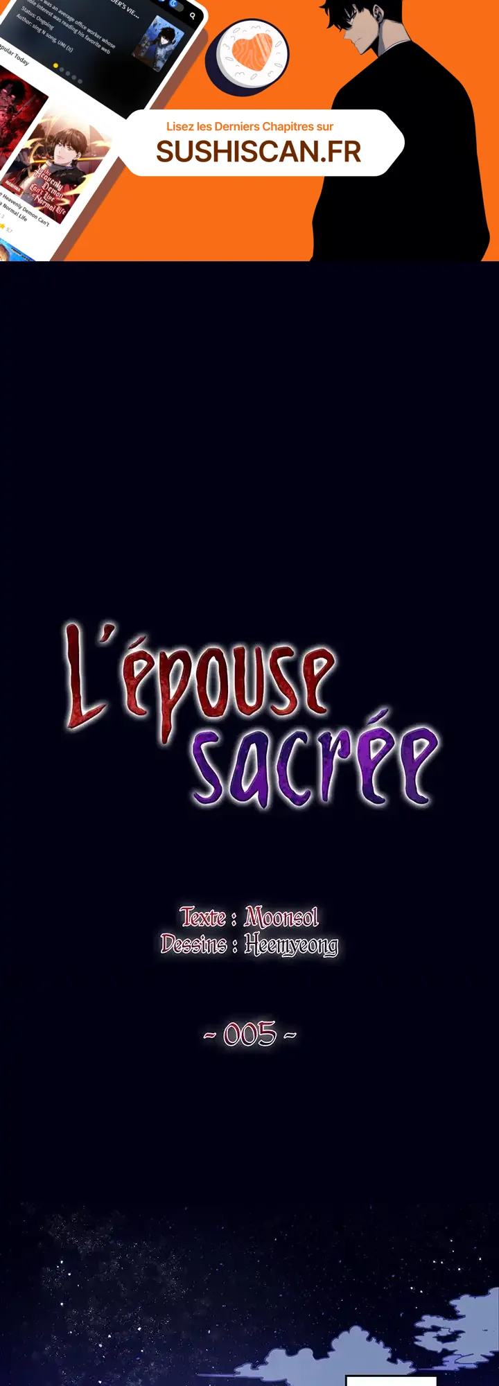 Lisez le dernier manga L’épouse sacrée Chapitre 5 sur SushiScan. Le manga L’épouse sacrée est toujours mis à jour sur SushiScan. N'oubliez pas de lire les autres mises à jour de manga. Une liste de collections de manga SushiScan se trouve dans le menu Liste de manga.