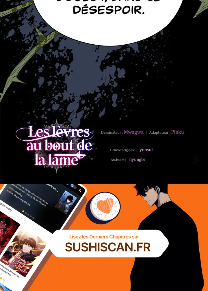 Lisez le dernier manga Les lèvres au bout de la lame Chapitre 77 sur SushiScan. Le manga Les lèvres au bout de la lame est toujours mis à jour sur SushiScan. N'oubliez pas de lire les autres mises à jour de manga. Une liste de collections de manga SushiScan se trouve dans le menu Liste de manga.