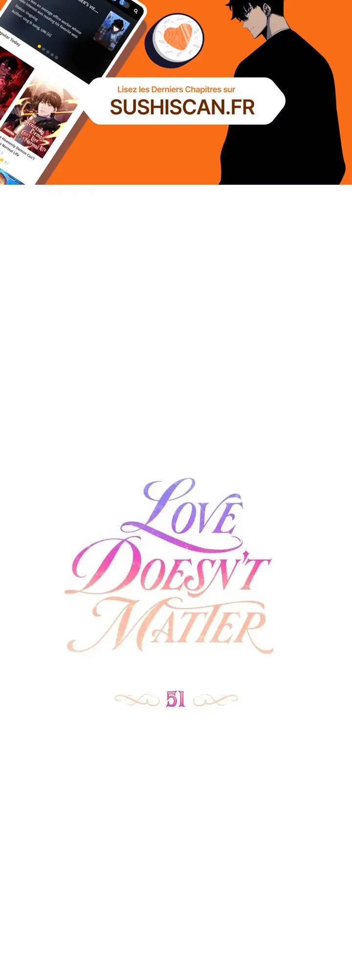 Lisez le dernier manga Love Doesn’t Matter Chapitre 51 sur SushiScan. Le manga Love Doesn’t Matter est toujours mis à jour sur SushiScan. N'oubliez pas de lire les autres mises à jour de manga. Une liste de collections de manga SushiScan se trouve dans le menu Liste de manga.