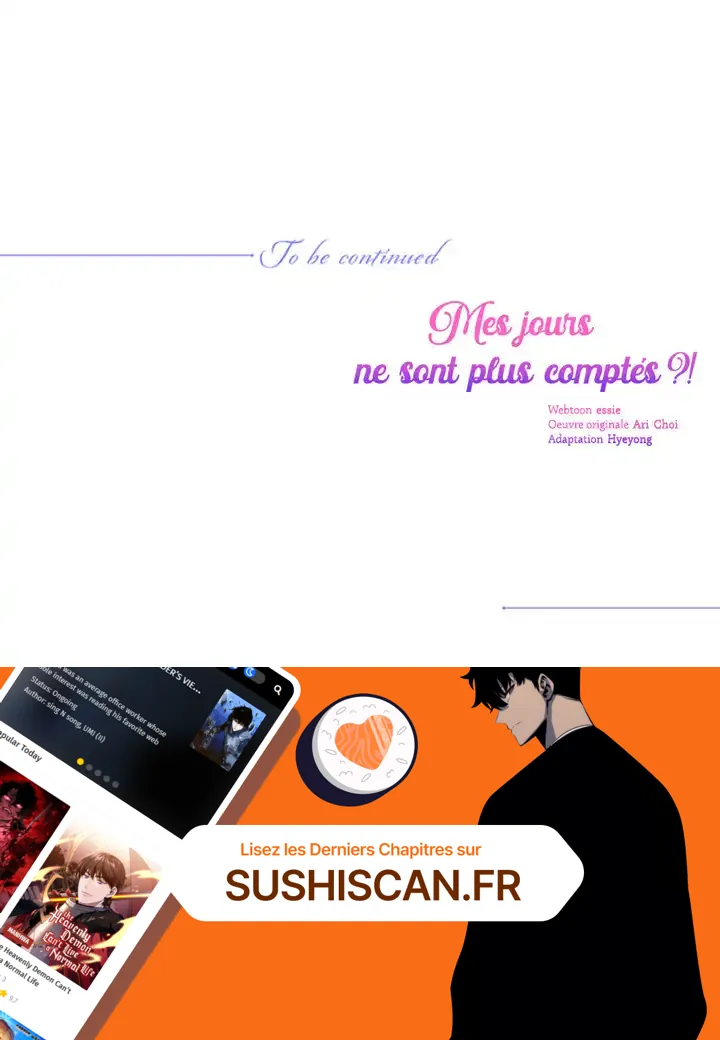 Lisez le dernier manga Mes jours ne sont plus comptés ?! Chapitre 45 sur SushiScan. Le manga Mes jours ne sont plus comptés ?! est toujours mis à jour sur SushiScan. N'oubliez pas de lire les autres mises à jour de manga. Une liste de collections de manga SushiScan se trouve dans le menu Liste de manga.