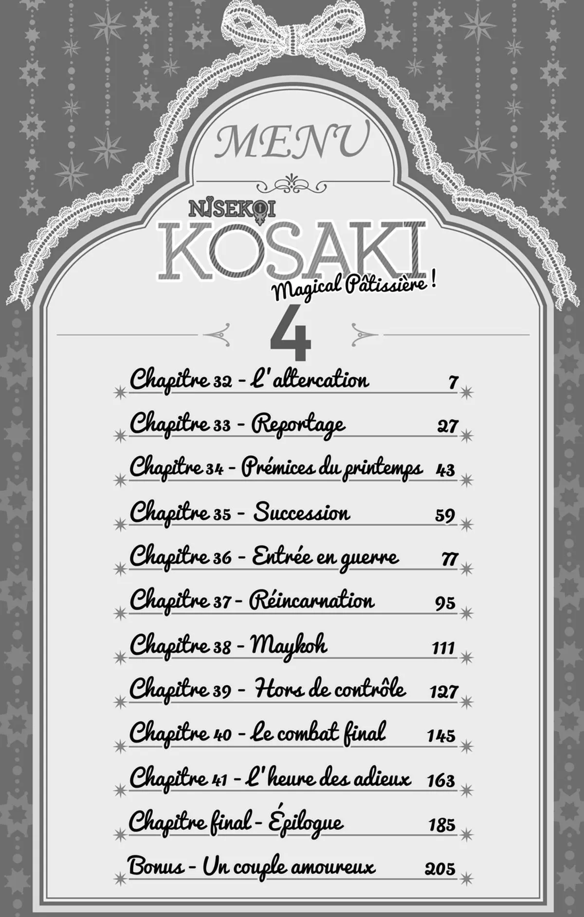 Lisez le dernier manga Nisekoi – Kosaki Magicala Pâtissière ! Tome 4 sur SushiScan. Le manga Nisekoi – Kosaki Magicala Pâtissière ! est toujours mis à jour sur SushiScan. N'oubliez pas de lire les autres mises à jour de manga. Une liste de collections de manga SushiScan se trouve dans le menu Liste de manga.