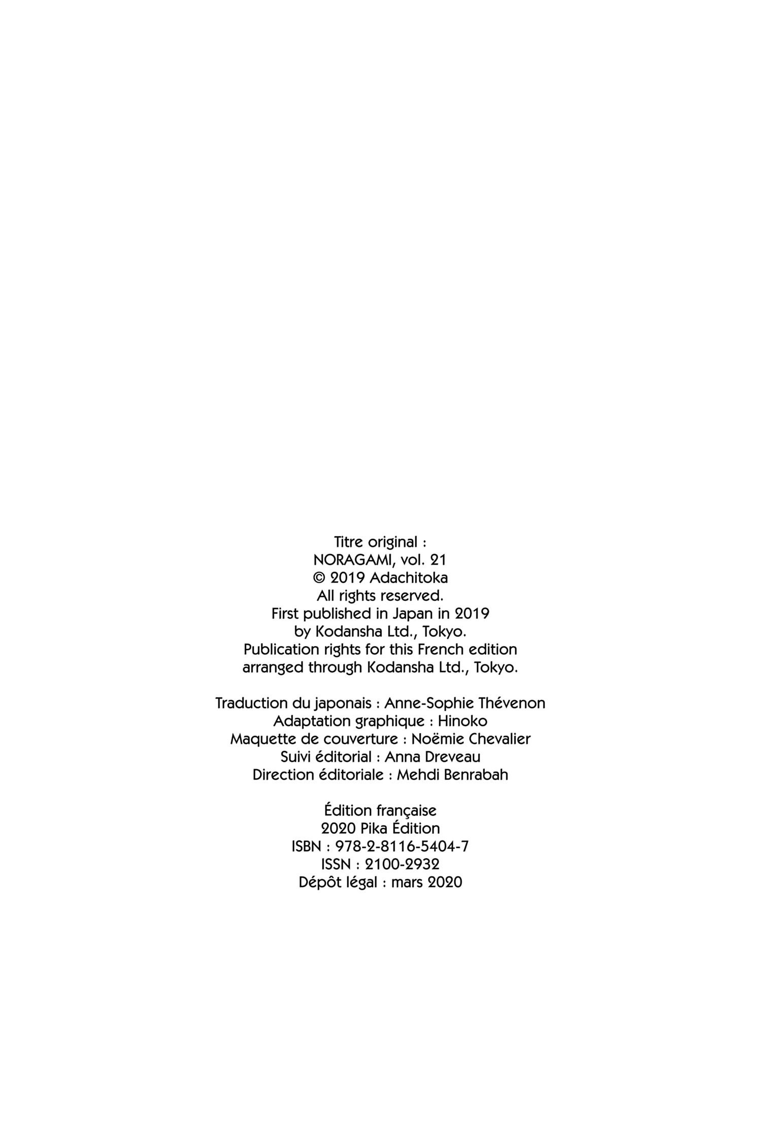 Lisez le dernier manga Noragami Tome 21 sur SushiScan. Le manga Noragami est toujours mis à jour sur SushiScan. N'oubliez pas de lire les autres mises à jour de manga. Une liste de collections de manga SushiScan se trouve dans le menu Liste de manga.