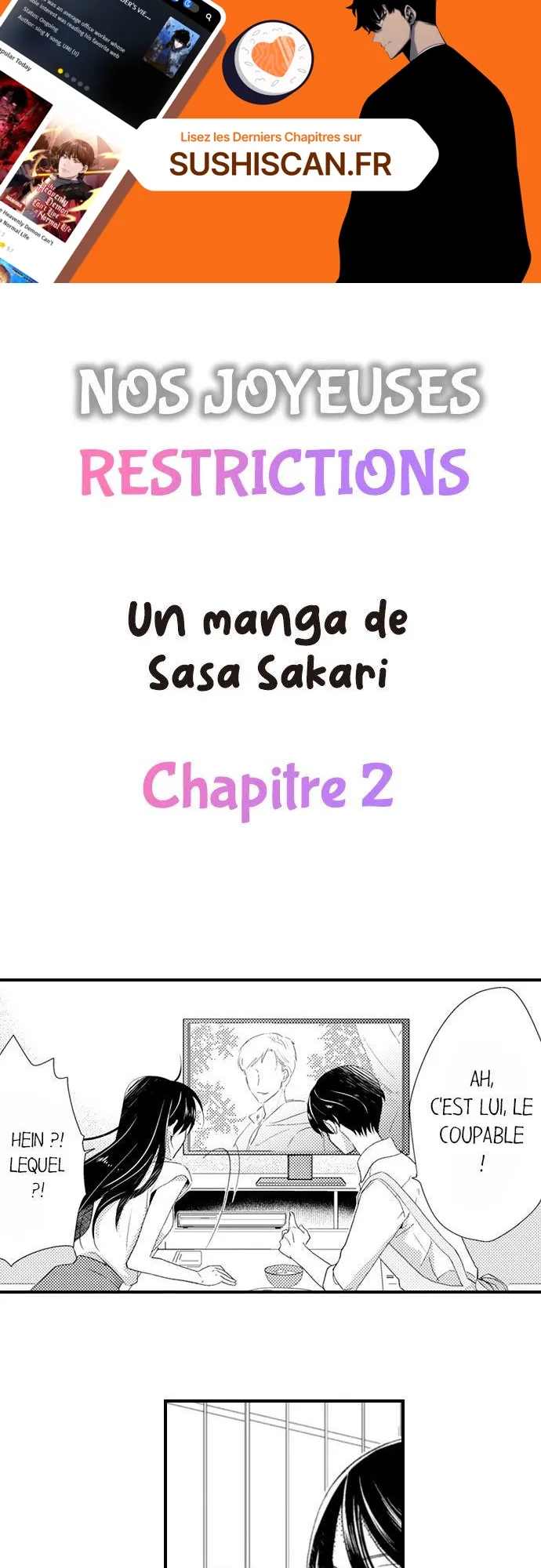Lisez le dernier manga Nos joyeuses restrictions Chapitre 2 sur SushiScan. Le manga Nos joyeuses restrictions est toujours mis à jour sur SushiScan. N'oubliez pas de lire les autres mises à jour de manga. Une liste de collections de manga SushiScan se trouve dans le menu Liste de manga.