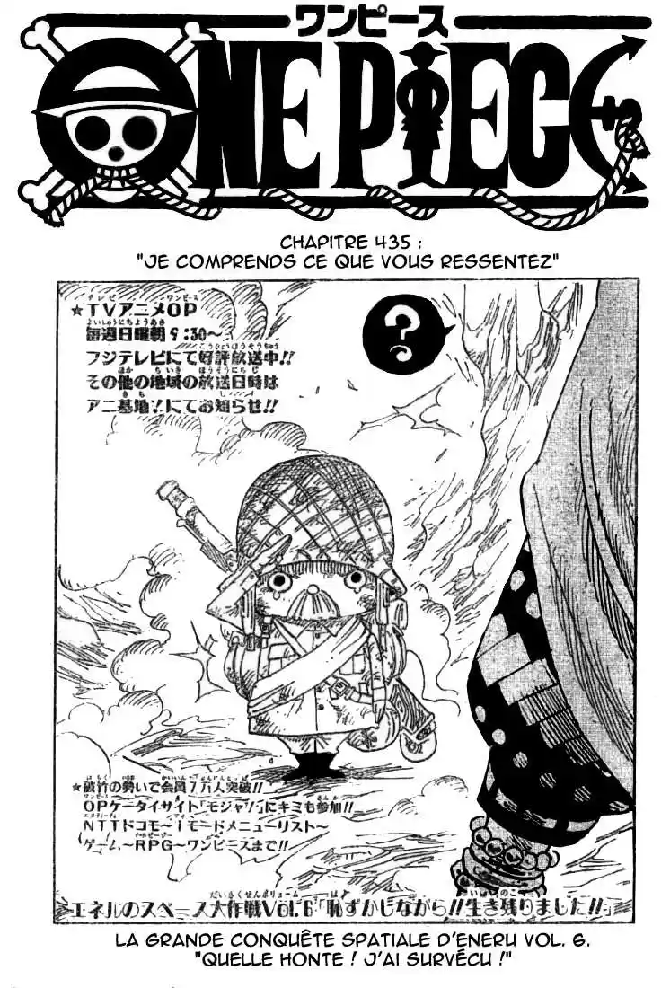 Lisez le dernier manga One Piece Chapitre 435 sur SushiScan. Le manga One Piece est toujours mis à jour sur SushiScan. N'oubliez pas de lire les autres mises à jour de manga. Une liste de collections de manga SushiScan se trouve dans le menu Liste de manga.