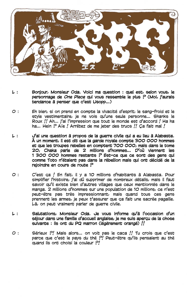 Lisez le dernier manga One Piece Scans Couleur Chapitre 221 sur SushiScan. Le manga One Piece Scans Couleur est toujours mis à jour sur SushiScan. N'oubliez pas de lire les autres mises à jour de manga. Une liste de collections de manga SushiScan se trouve dans le menu Liste de manga.