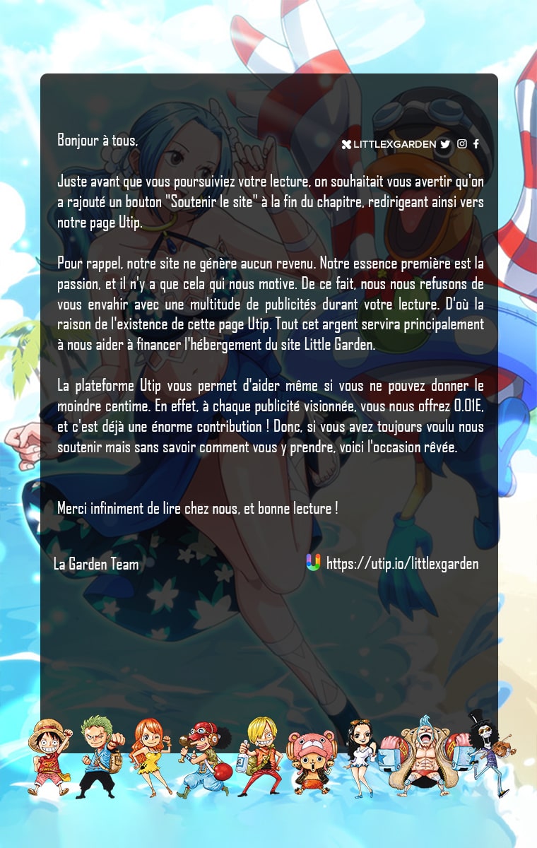 Lisez le dernier manga One Piece Scans Couleur Chapitre 587 sur SushiScan. Le manga One Piece Scans Couleur est toujours mis à jour sur SushiScan. N'oubliez pas de lire les autres mises à jour de manga. Une liste de collections de manga SushiScan se trouve dans le menu Liste de manga.