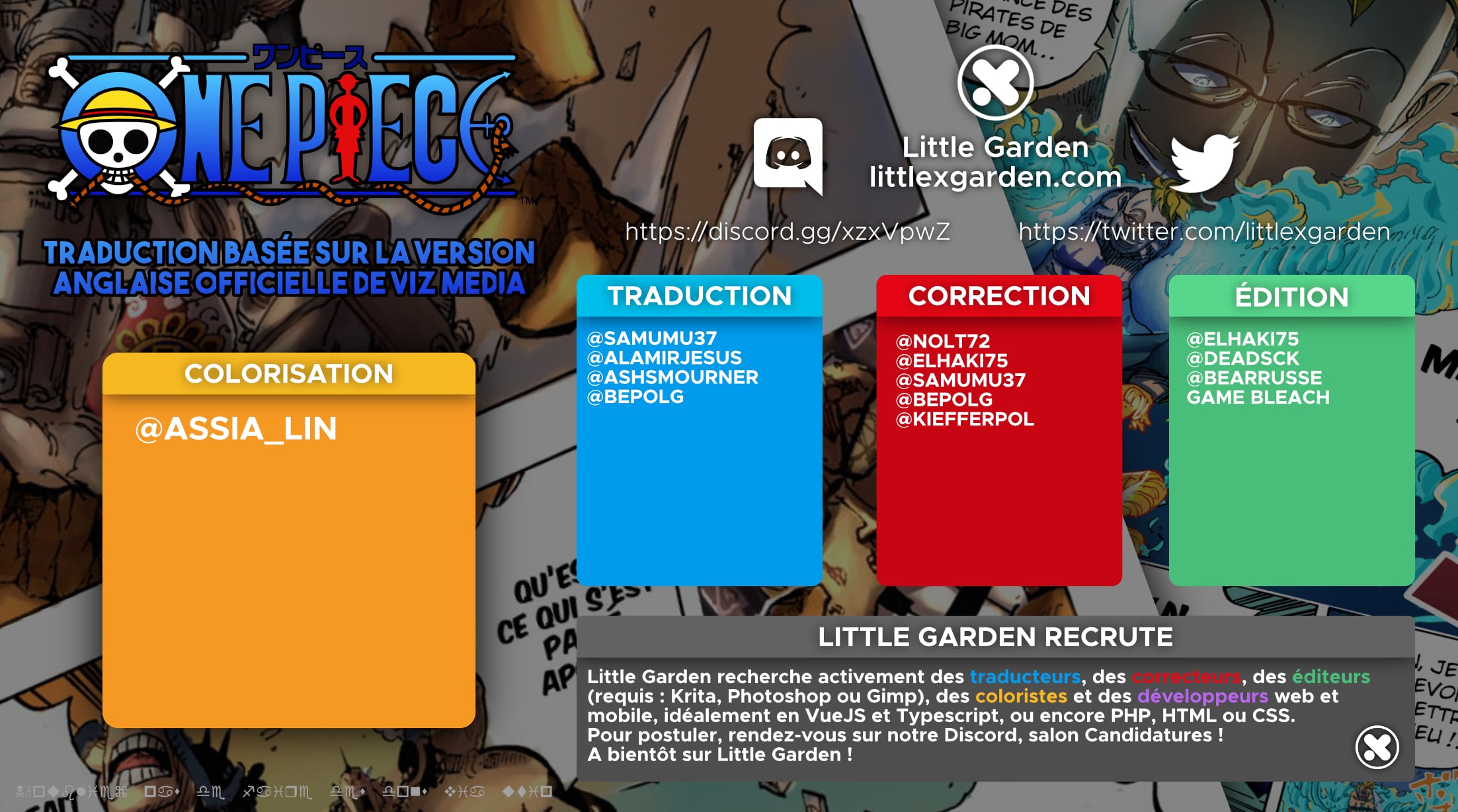 Lisez le dernier manga One Piece Scans Couleur Chapitre 985 sur SushiScan. Le manga One Piece Scans Couleur est toujours mis à jour sur SushiScan. N'oubliez pas de lire les autres mises à jour de manga. Une liste de collections de manga SushiScan se trouve dans le menu Liste de manga.