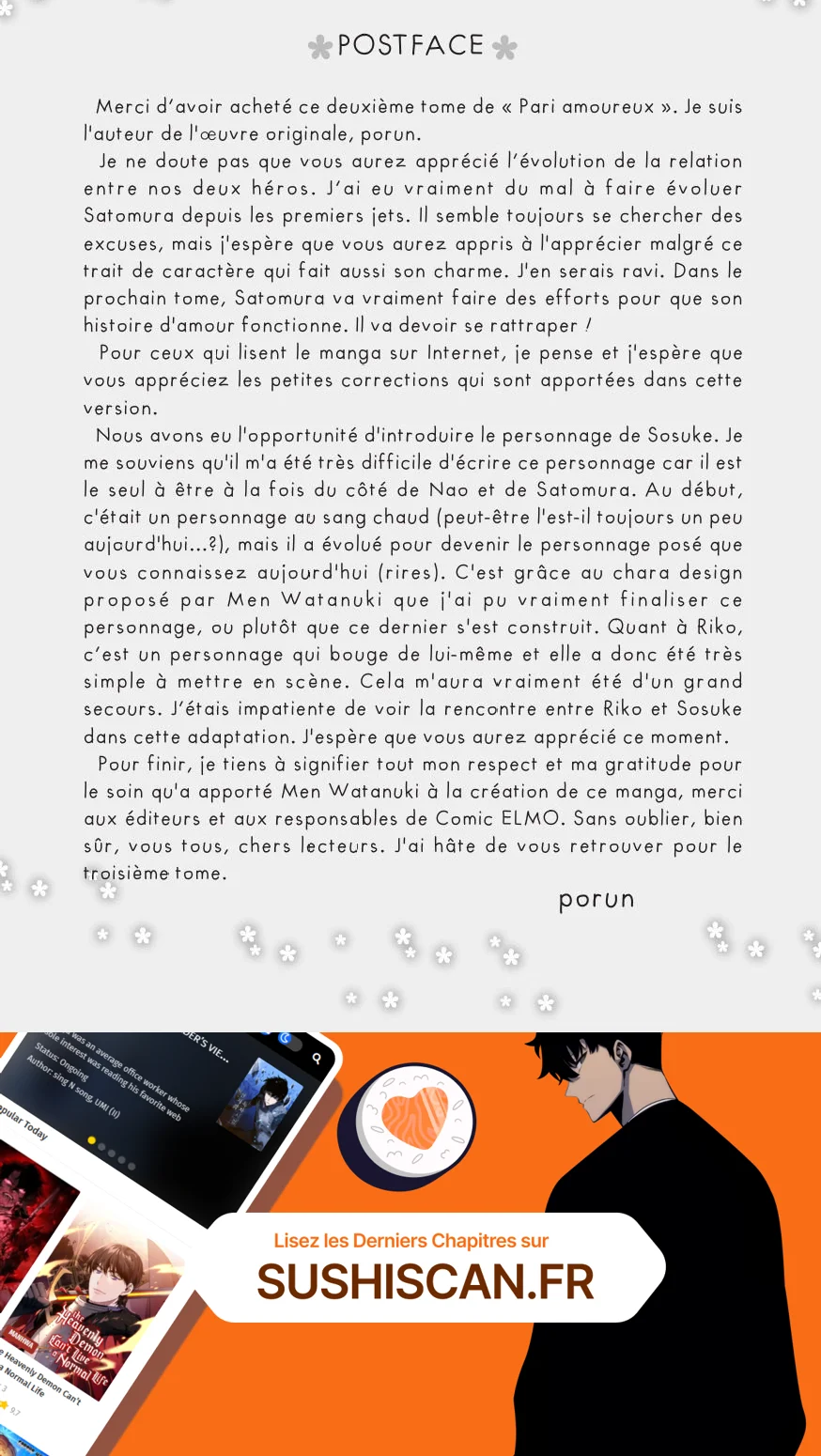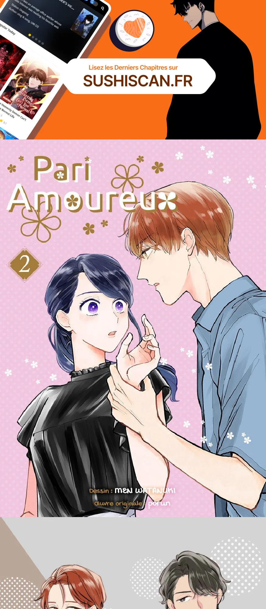 Lisez le dernier manga Pari amoureux Volume 2 sur SushiScan. Le manga Pari amoureux est toujours mis à jour sur SushiScan. N'oubliez pas de lire les autres mises à jour de manga. Une liste de collections de manga SushiScan se trouve dans le menu Liste de manga.