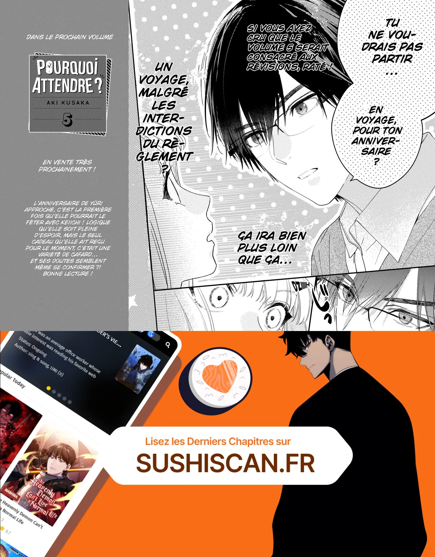 Lisez le dernier manga Pourquoi attendre ? Tome 4 sur SushiScan. Le manga Pourquoi attendre ? est toujours mis à jour sur SushiScan. N'oubliez pas de lire les autres mises à jour de manga. Une liste de collections de manga SushiScan se trouve dans le menu Liste de manga.