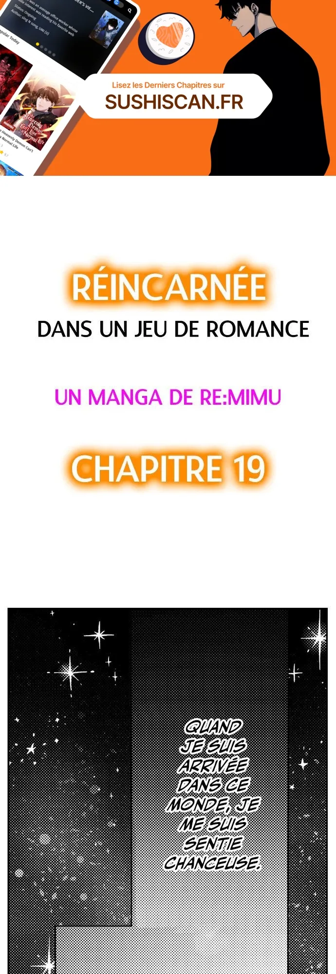 Lisez le dernier manga Réincarnée dans un jeu de romance Chapitre 19 sur SushiScan. Le manga Réincarnée dans un jeu de romance est toujours mis à jour sur SushiScan. N'oubliez pas de lire les autres mises à jour de manga. Une liste de collections de manga SushiScan se trouve dans le menu Liste de manga.
