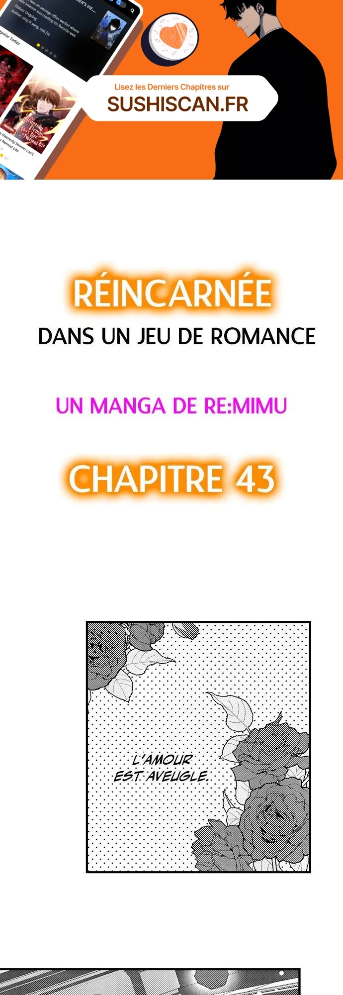 Lisez le dernier manga Réincarnée dans un jeu de romance Chapitre 43 sur SushiScan. Le manga Réincarnée dans un jeu de romance est toujours mis à jour sur SushiScan. N'oubliez pas de lire les autres mises à jour de manga. Une liste de collections de manga SushiScan se trouve dans le menu Liste de manga.