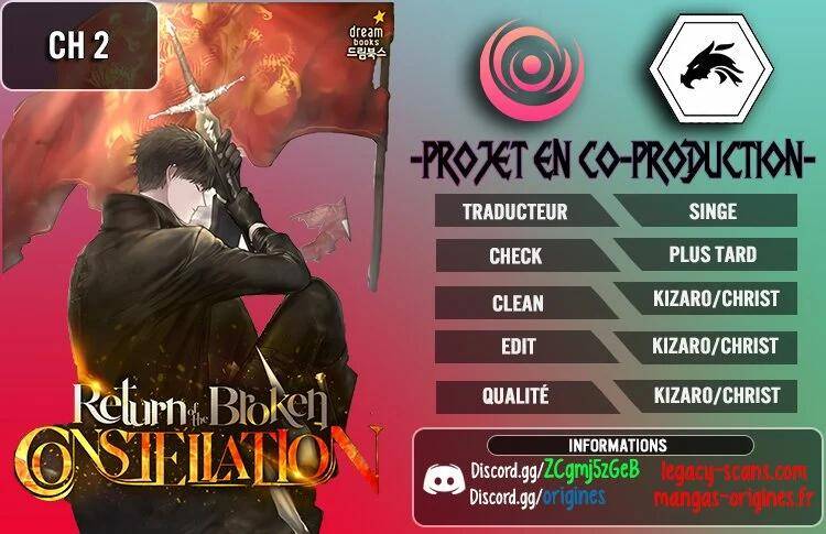 Lisez le dernier manga Return of the Broken Constellation Chapitre 2 VF sur SushiScan. Le manga Return of the Broken Constellation est toujours mis à jour sur SushiScan. N'oubliez pas de lire les autres mises à jour de manga. Une liste de collections de manga SushiScan se trouve dans le menu Liste de manga.