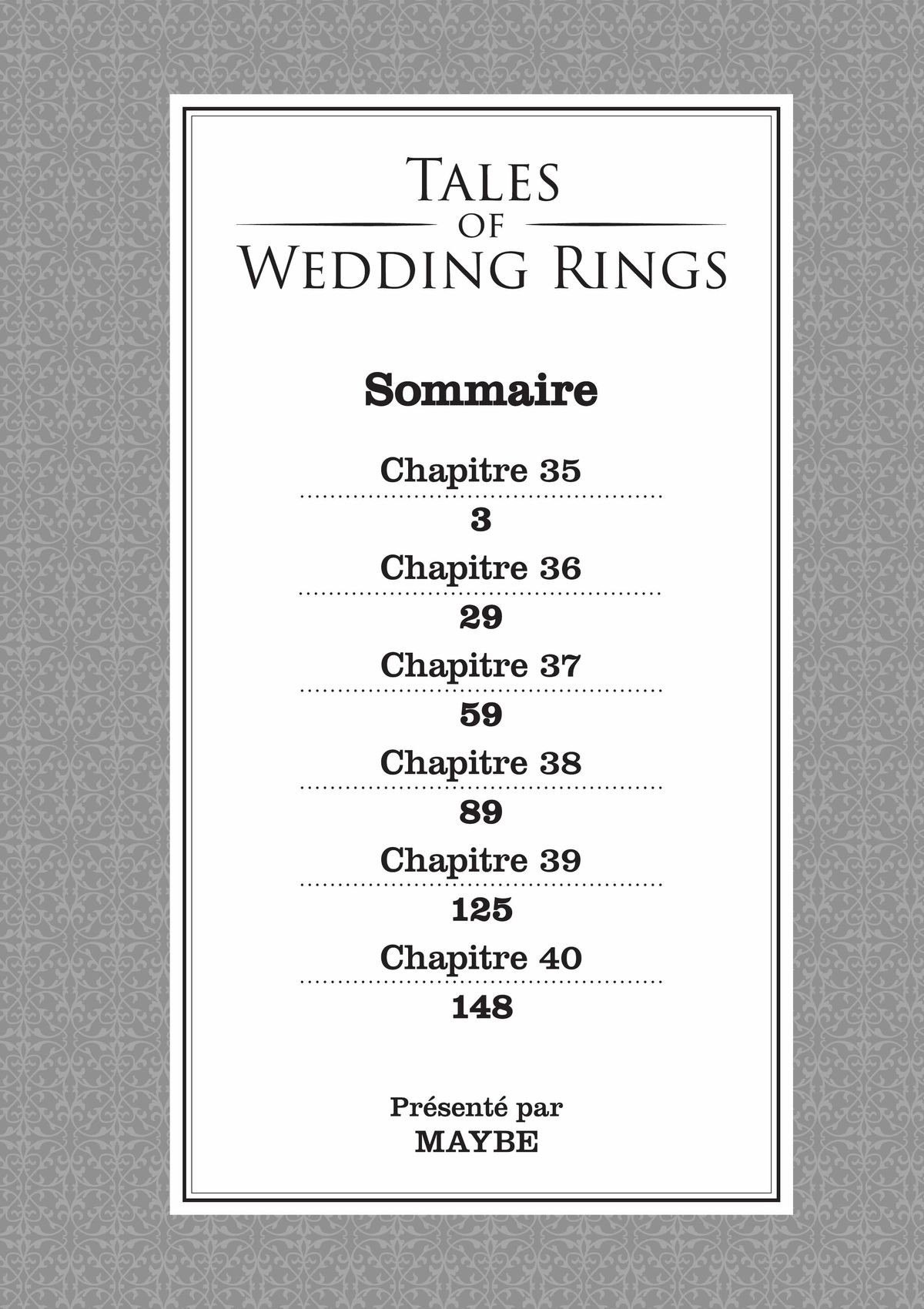 Lisez le dernier manga Tales of Wedding Rings Tome 7 sur SushiScan. Le manga Tales of Wedding Rings est toujours mis à jour sur SushiScan. N'oubliez pas de lire les autres mises à jour de manga. Une liste de collections de manga SushiScan se trouve dans le menu Liste de manga.