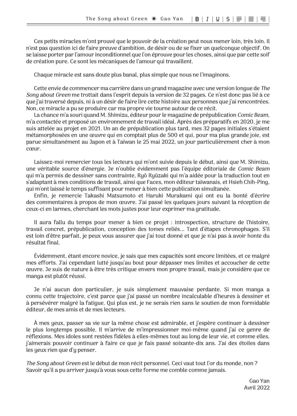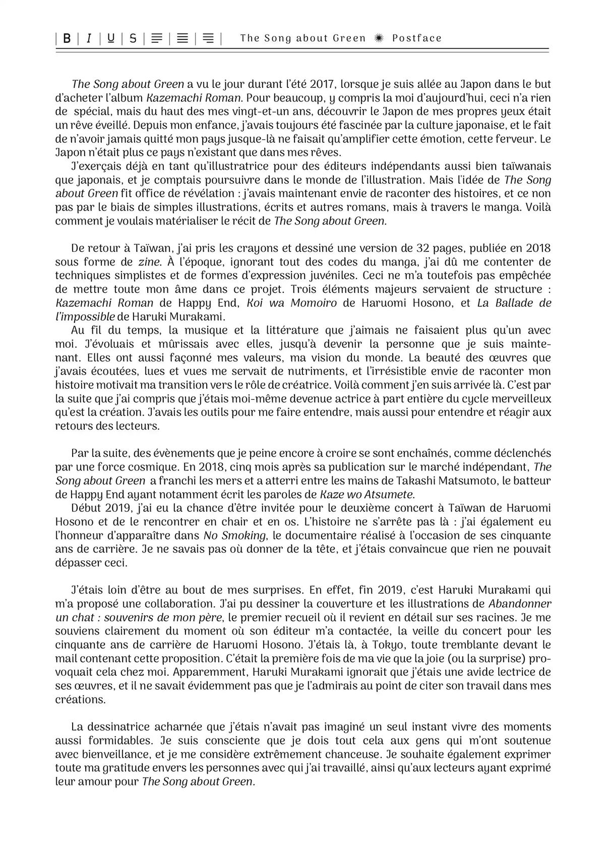 Lisez le dernier manga The Song About Green Tome 2 sur SushiScan. Le manga The Song About Green est toujours mis à jour sur SushiScan. N'oubliez pas de lire les autres mises à jour de manga. Une liste de collections de manga SushiScan se trouve dans le menu Liste de manga.