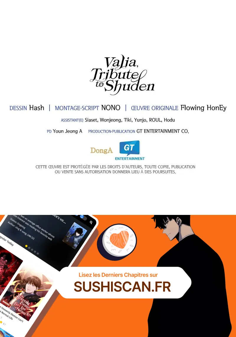 Lisez le dernier manga Valia, Tribute to Shuden Chapitre 59 sur SushiScan. Le manga Valia, Tribute to Shuden est toujours mis à jour sur SushiScan. N'oubliez pas de lire les autres mises à jour de manga. Une liste de collections de manga SushiScan se trouve dans le menu Liste de manga.