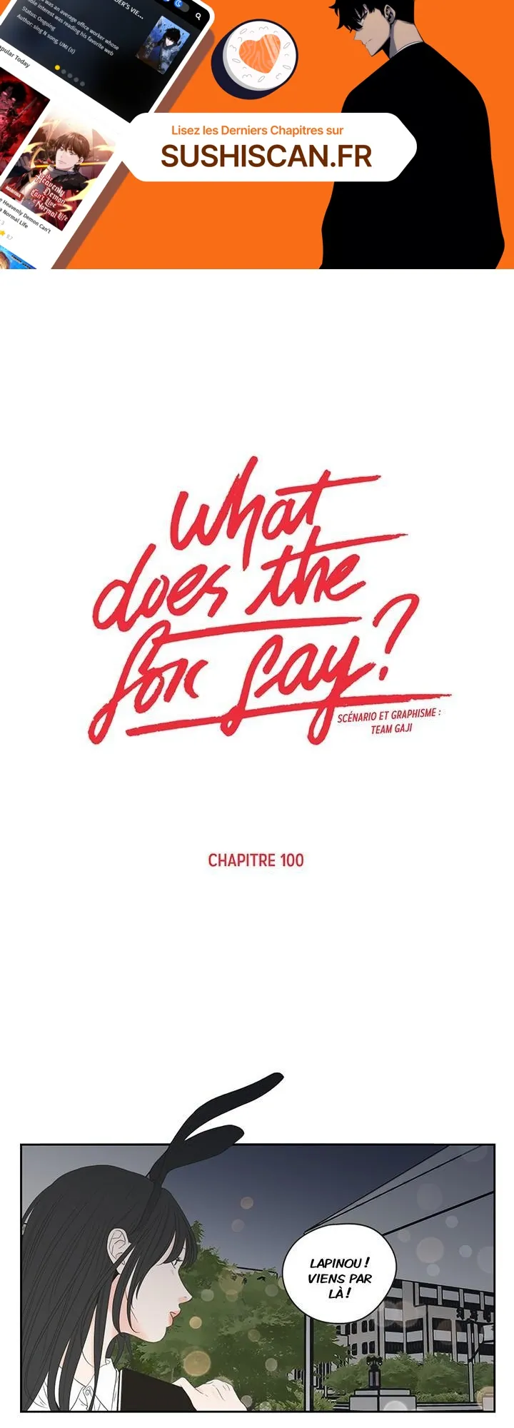 Lisez le dernier manga What Does the Fox Say? Chapitre 100 sur SushiScan. Le manga What Does the Fox Say? est toujours mis à jour sur SushiScan. N'oubliez pas de lire les autres mises à jour de manga. Une liste de collections de manga SushiScan se trouve dans le menu Liste de manga.