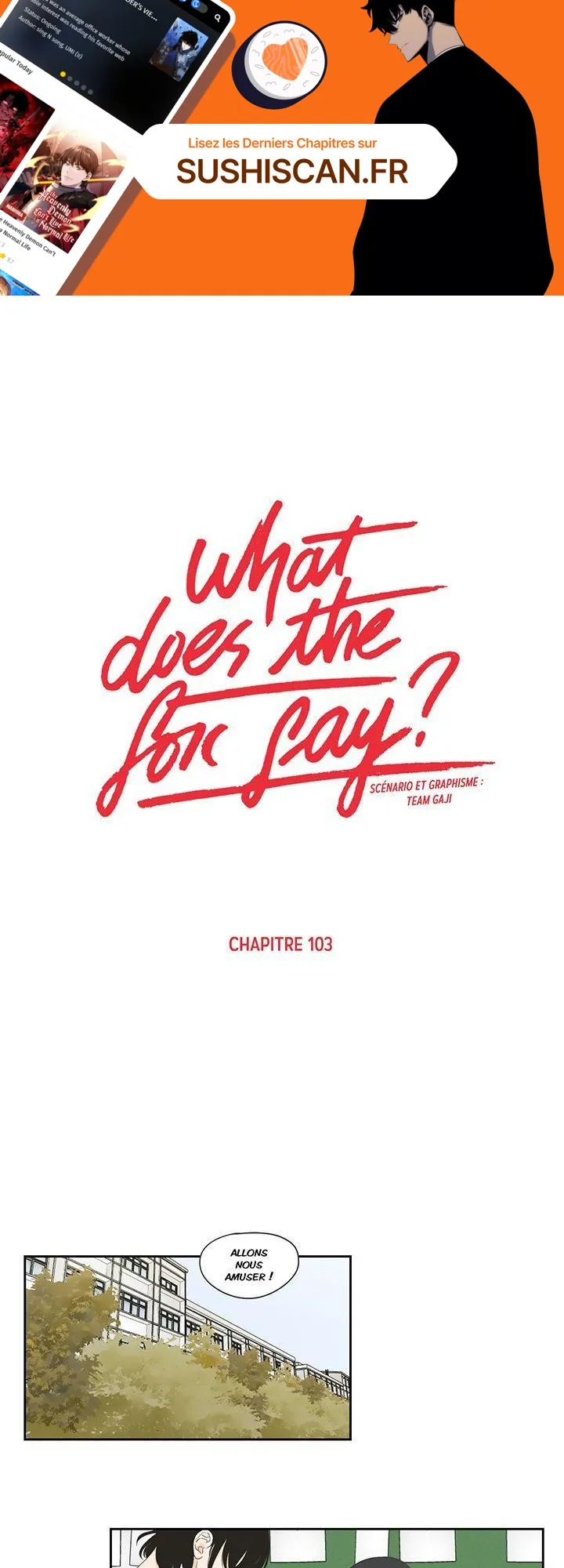 Lisez le dernier manga What Does the Fox Say? Chapitre 103 sur SushiScan. Le manga What Does the Fox Say? est toujours mis à jour sur SushiScan. N'oubliez pas de lire les autres mises à jour de manga. Une liste de collections de manga SushiScan se trouve dans le menu Liste de manga.