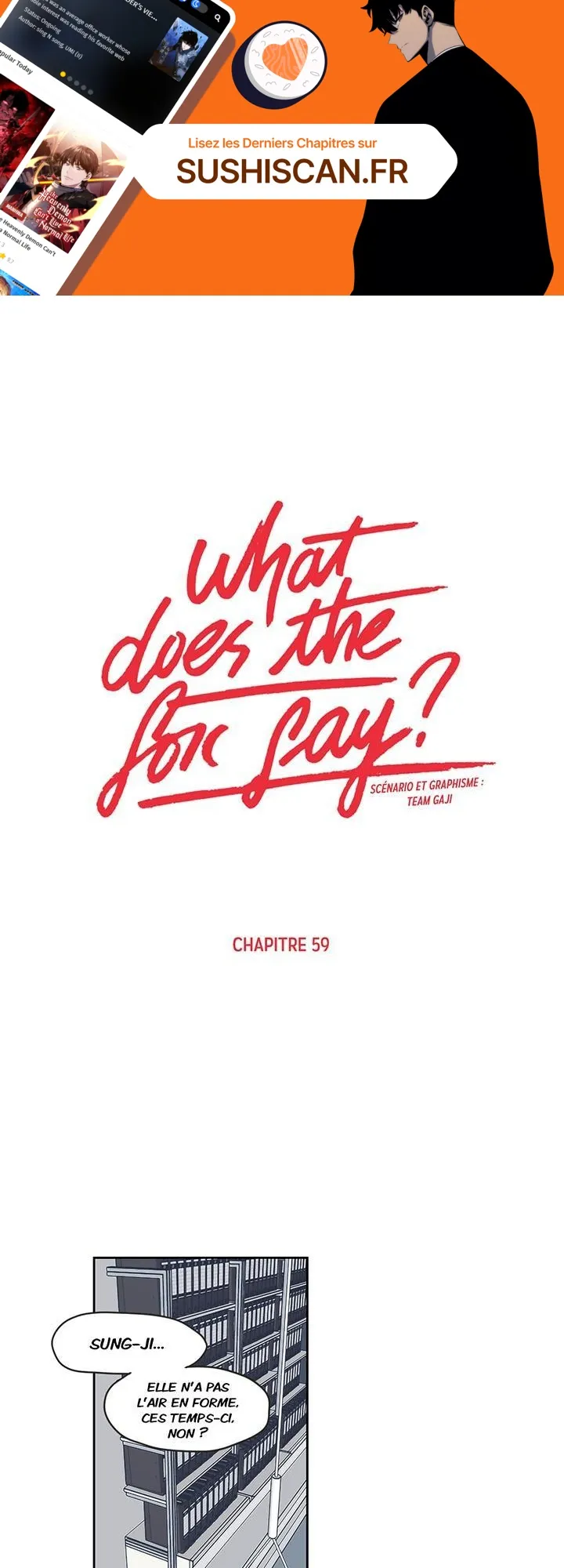 Lisez le dernier manga What Does the Fox Say? Chapitre 59 sur SushiScan. Le manga What Does the Fox Say? est toujours mis à jour sur SushiScan. N'oubliez pas de lire les autres mises à jour de manga. Une liste de collections de manga SushiScan se trouve dans le menu Liste de manga.